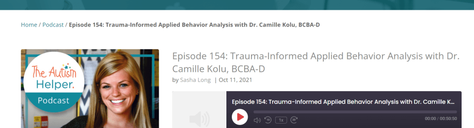 Just can’t wait for the CEU course on autism and trauma to be posted in the coming months? Tune in to The Autism Helper’s podcast. Dr. Kolu’s interview with Sasha Long, BCBA is live and we’re excited to share it with you!